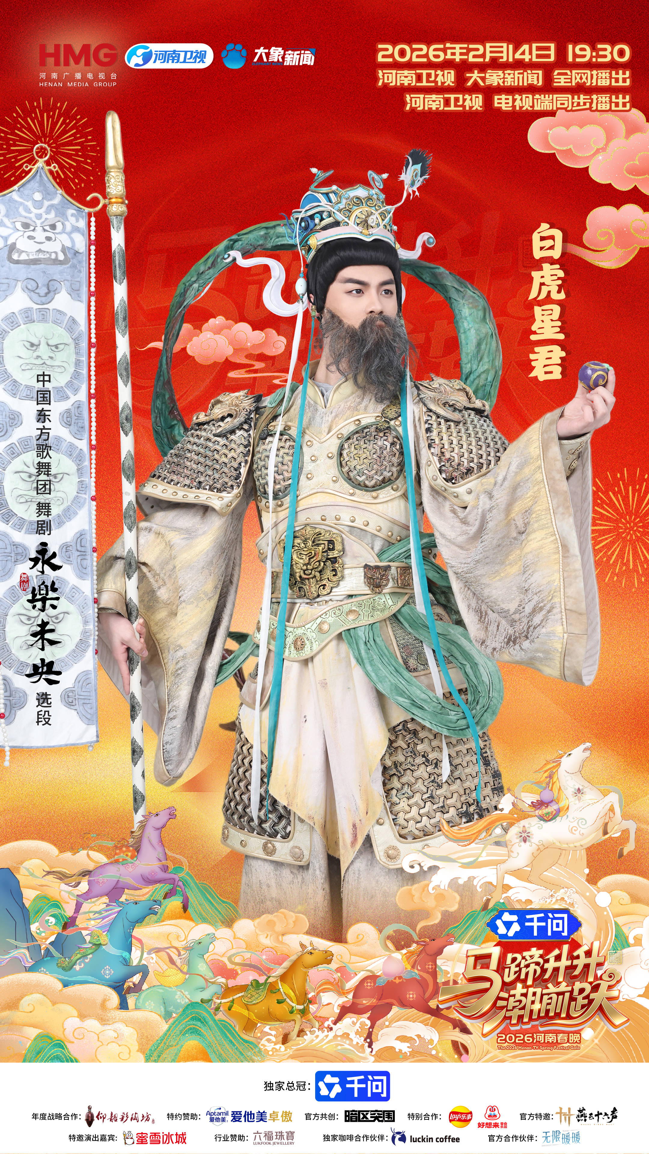 2月14日19:30,锁定河南卫视、大象新闻,看杨丽萍的磅礴马舞、陈丽君的剑舞木兰、关晓彤的瑞鸟报春、刘宇的奇幻财神,见证壁画神仙“复活”、机器人少林“习武”、非遗技艺与数字美学交融。正如晚会主题所言——“马蹄升升潮前跃”,这不仅是一场视听盛宴,更是一封写给传统文化的当代情书。